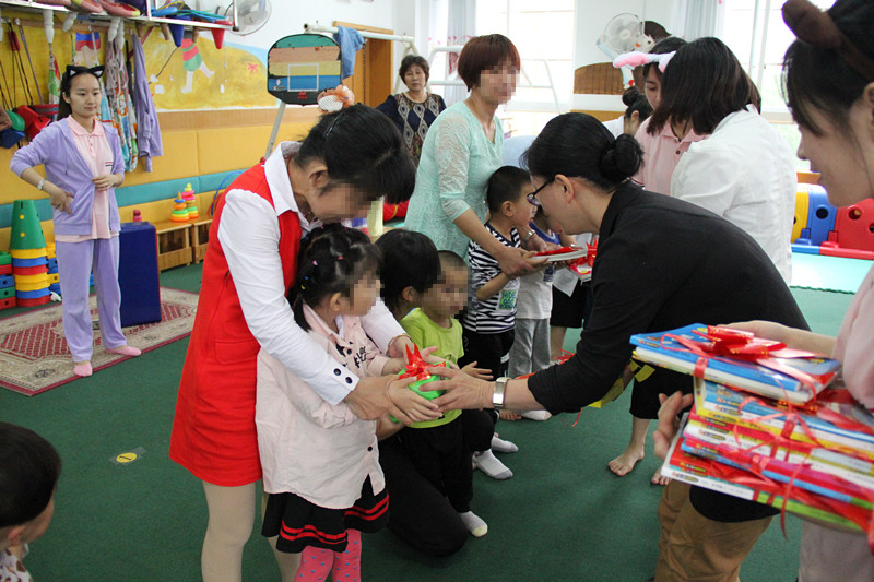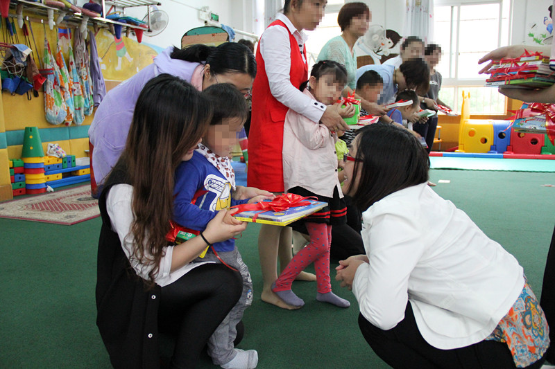 走進陽光樂園,學校老師對我們的到來表示了歡迎,并向我們簡要介紹了學校目前在校孩子的總體情況和康復狀況。此時恰逢孩子們的游戲時間,老師帶領(lǐng)我們觀看了孩子們做游戲。在日常生活中,這些特殊兒童的言行舉止或許和常人略有不同,但在游戲過程中,這些孩子透露出和其他孩子一樣的天真和爛漫。游戲過程中,一位可愛的孩子想請我們和他一起做游戲,收到突然的邀請,讓我們感到又驚訝又喜悅。僅僅一個小時左右的游戲時間,孩子們的可愛和友善深深打動了我們,我們被這里的孩子們不易的成長經(jīng)歷深深感動,也對所有老師們付出的辛勤汗水深表敬意,同時也相信,在這樣的環(huán)境中,特殊兒童定能有所康復。最后,我們還向孩子們贈送了兒童書籍作為節(jié)日禮物,孩子一聲聲甜甜的“謝謝”又一次讓我們堅定地認為,在這里他們一定能健康、快樂地成長。