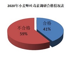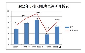 從上表看出,2020年小麥嘔吐毒素合格情況并不樂觀,根據資料表明田間鐮刀菌毒素產生主要受氣象條件的影響,包括溫度、濕度、干旱、降水等,而在收割階段溫濕度也會影響嘔吐毒素的含量。溫度和濕度越高,真菌生長越快和產毒越高(《糧食中嘔吐毒素的研究進展》糧食加工2016 年第41卷第4期)。嘉興每年6月進入梅雨季節(jié),而6月也正是小麥收割的高峰期,在前期雨量不多的情況下,80個小麥樣品嘔吐毒素超標情況已達59%,在接下來的梅雨季,超標情況可能會進一步加劇。
