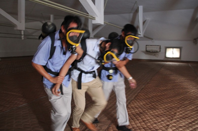 在應急救援演練環(huán)節(jié)中,全體參演人員抽簽分成兩組,進行實倉演練。在演練過程中,小組人員迅速確定隊長及各自分工,按照情景設(shè)定,事先安排進倉及倉外守候人員,而后根據(jù)事先給予的暗簽,對需要進行呼吸器他救的人員及時連接他救裝置進行他救,對空氣呼吸器氣量不足等不明原因暈倒的人員在最短時間內(nèi)通過他救裝置進行現(xiàn)場救援并合力“救出”至倉外,搶救的同時安全監(jiān)督人員及時向領(lǐng)導報告現(xiàn)場情況。演練過程中,大家臨危不亂、互幫互助,做到各司其職、有條不紊。兩組人員分別在66秒、67秒內(nèi)完成演練任務(wù),但其中一組在救援暈倒人員中卻忘了連接他救裝置。全體參演人員通過親身實踐及觀摩他人演練,剖析合理做法,互相查找不足、吸取經(jīng)驗,將理論知識與實際操作進行了有效結(jié)合。