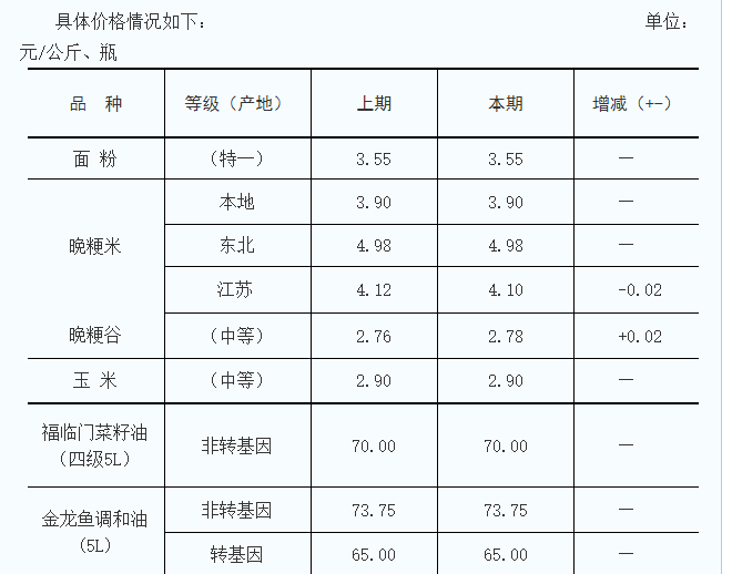 據(jù)監(jiān)測,202211日~117日,目前氣溫適宜糧油儲(chǔ)存,加上春節(jié)臨近,糧油將迎來銷售旺季,市區(qū)各糧油經(jīng)銷商備貨積極,市場成品糧油供應(yīng)品種豐富、貨源充足、銷售價(jià)格穩(wěn)定、供應(yīng)秩序良好。原糧晚粳谷市場價(jià)格小幅上漲,市場價(jià)格走勢向上;飼料市場供應(yīng)價(jià)格穩(wěn)定,貨源供應(yīng)充足,但銷售價(jià)格仍處于高位。
